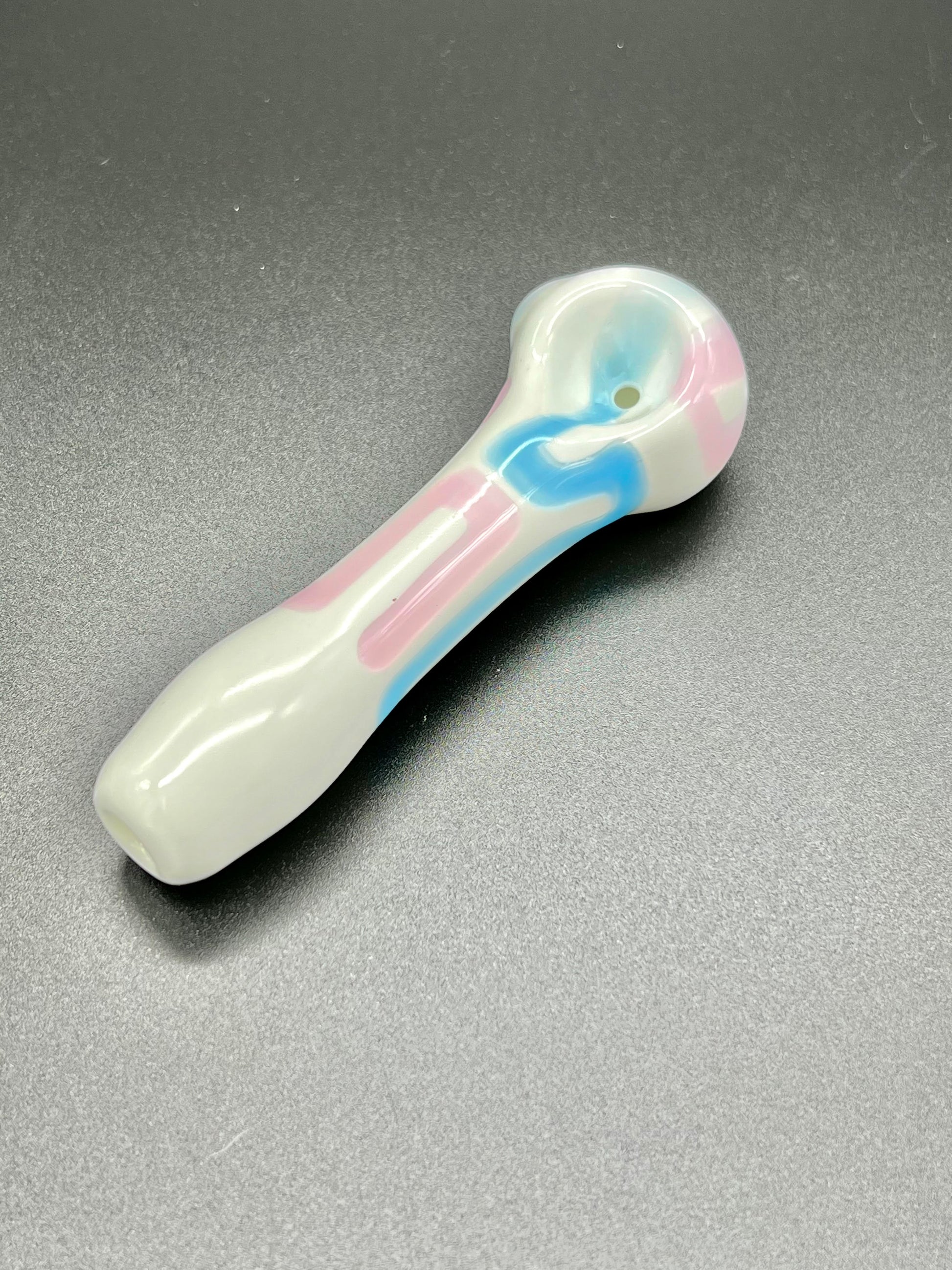 White spoon with 90's style pink and blue "candy stripes"