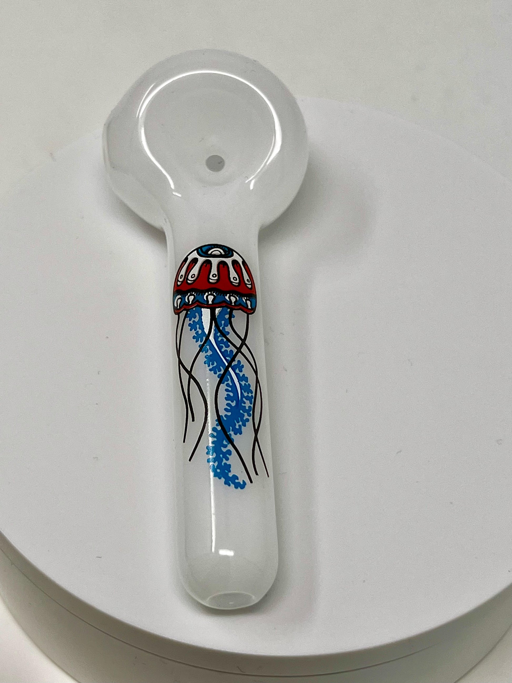 White spoon blown by Jellyfish Glass with red, white and blue jellyfish design