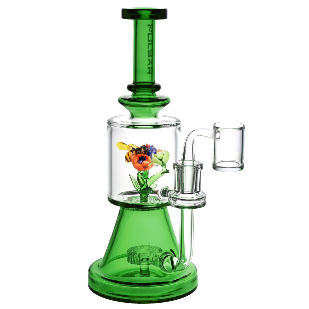 See what all the buzz is about! These Pulsar Bee Flower Dab Rigs stand 9.25 inches (23.5cm) tall and feature a precious pollinator visiting a fresh flower! Made of scientific-grade borosilicate glass, this dab rig features a disc perc and a honeycomb diffuser. Includes a 14mm quartz banger.
